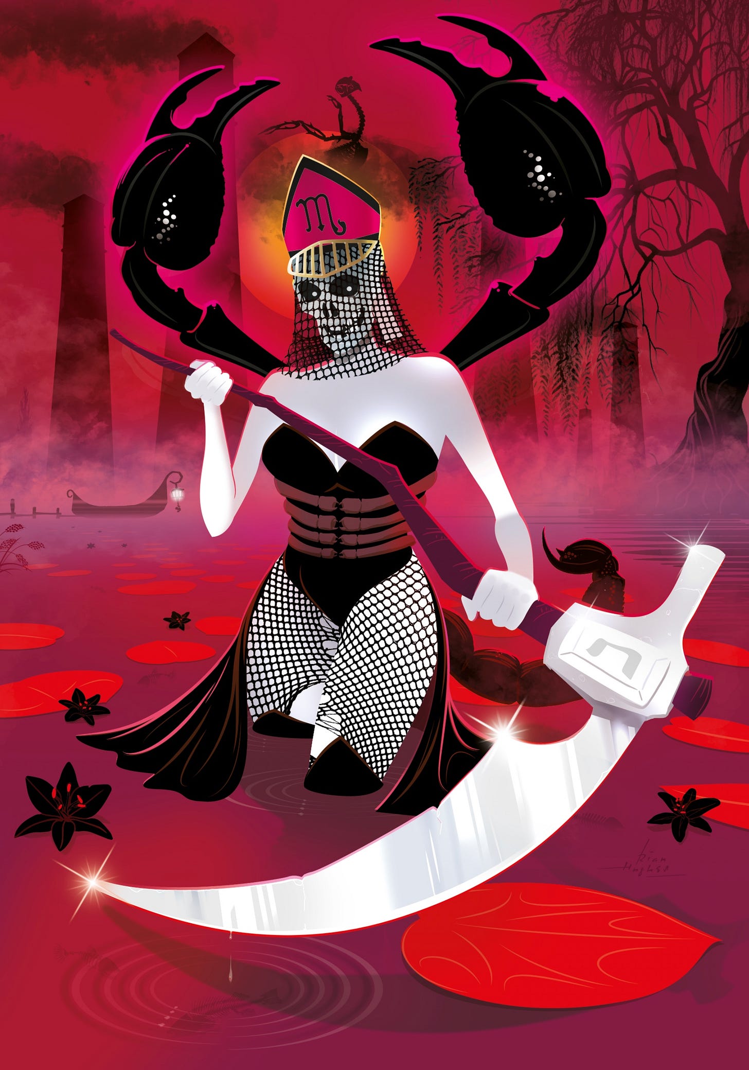 A GIANT SCORPION clings to Death’s back, so that see only its legs and pincers wrapped around her body like some nightmare couture. These articulated scorpion legs clenched around her midriff resemble the bones of a corset. The huge, upraised PINCERS at either side, like ghastly wings. The thorned venomous tail curled up behind.